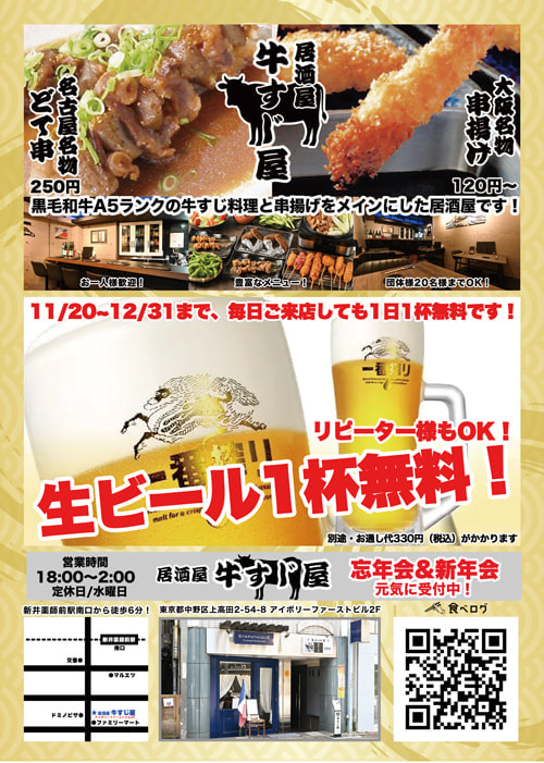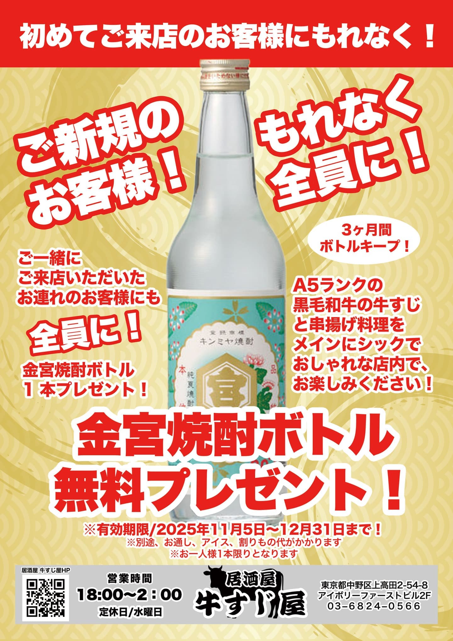 NEWS & TOPICS 2025.10.20【10/20~12/30】新規にご来店のお客様限定!金宮焼酎ボトルプレゼント中! 【営業時間変更のお知らせ】 18:00~2:00までの営業となります (定休日/水曜日) 皆様のお越しをお待ち申し上げます DRINK MENU ドリンクメニュー ビール、焼酎、日本酒、など 豊富なお酒をご用意しております FOOD MENU フードメニュー 和牛の牛すじ料理と 串揚げをメインに 居酒屋メニューも豊富に 取り揃えております GALLERY 店内の動画をご覧いただけます EVENT