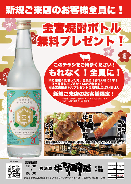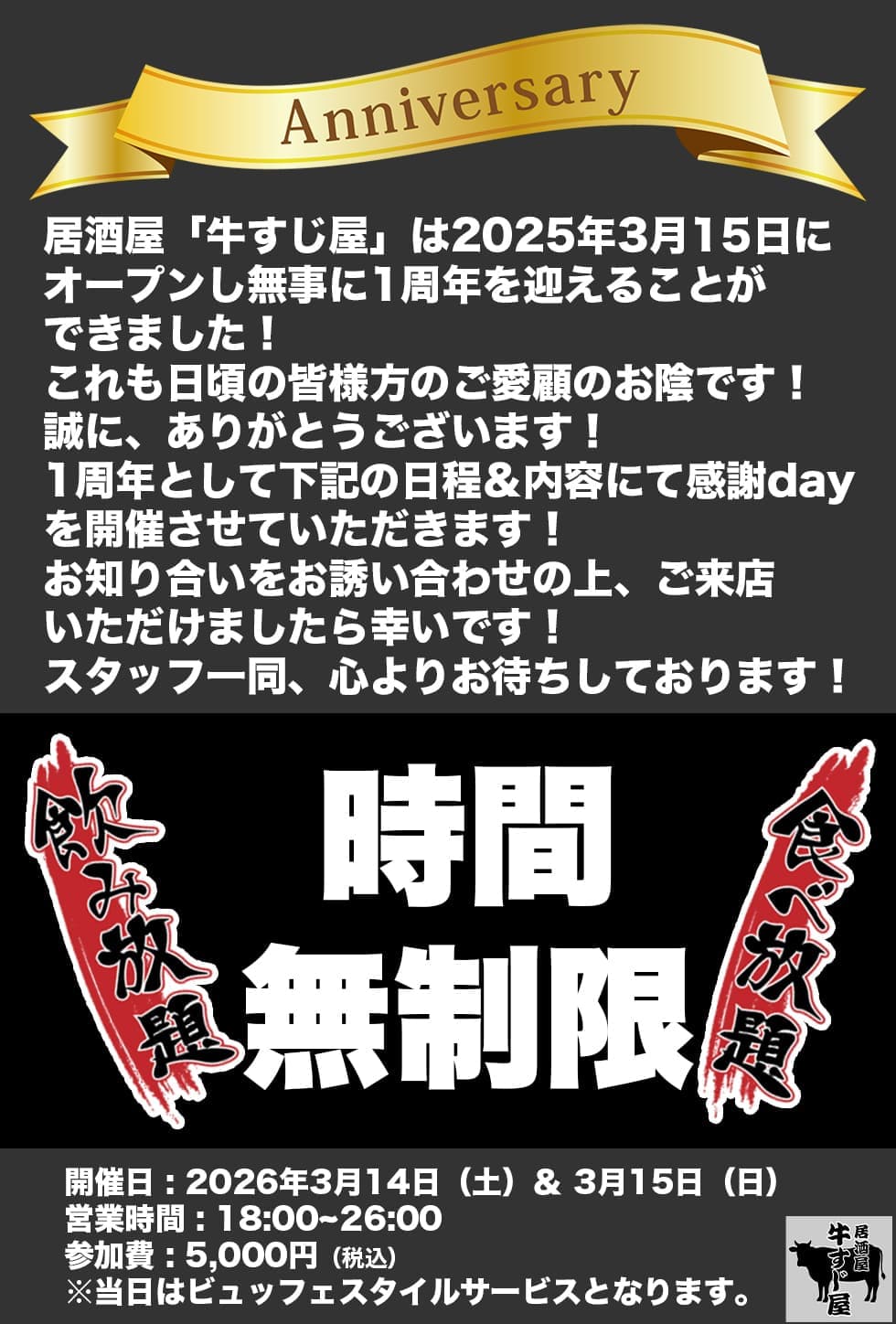 NEWS & TOPICS 2026.02.28【新規にご来店のお客様限定!金宮焼酎ボトルプレゼント中!】 【営業時間変更のお知らせ】 ※2026年3月1日〜 平日/18:00~2:00 金・土/18:00~5:00 に営業時間が変更となりました! DRINK MENU ドリンクメニュー ビール、焼酎、日本酒、など 豊富なお酒をご用意しております FOOD MENU フードメニュー 和牛の牛すじ料理と 串揚げをメインに 居酒屋メニューも豊富に 取り揃えております GALLERY EVENT